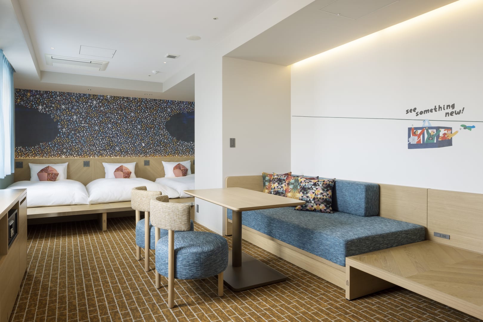 A concept room designed with elements inspired by the night view of Mount Hakodate, accommodating up to 4 guests and ideal for families or groups to relax and enjoy.