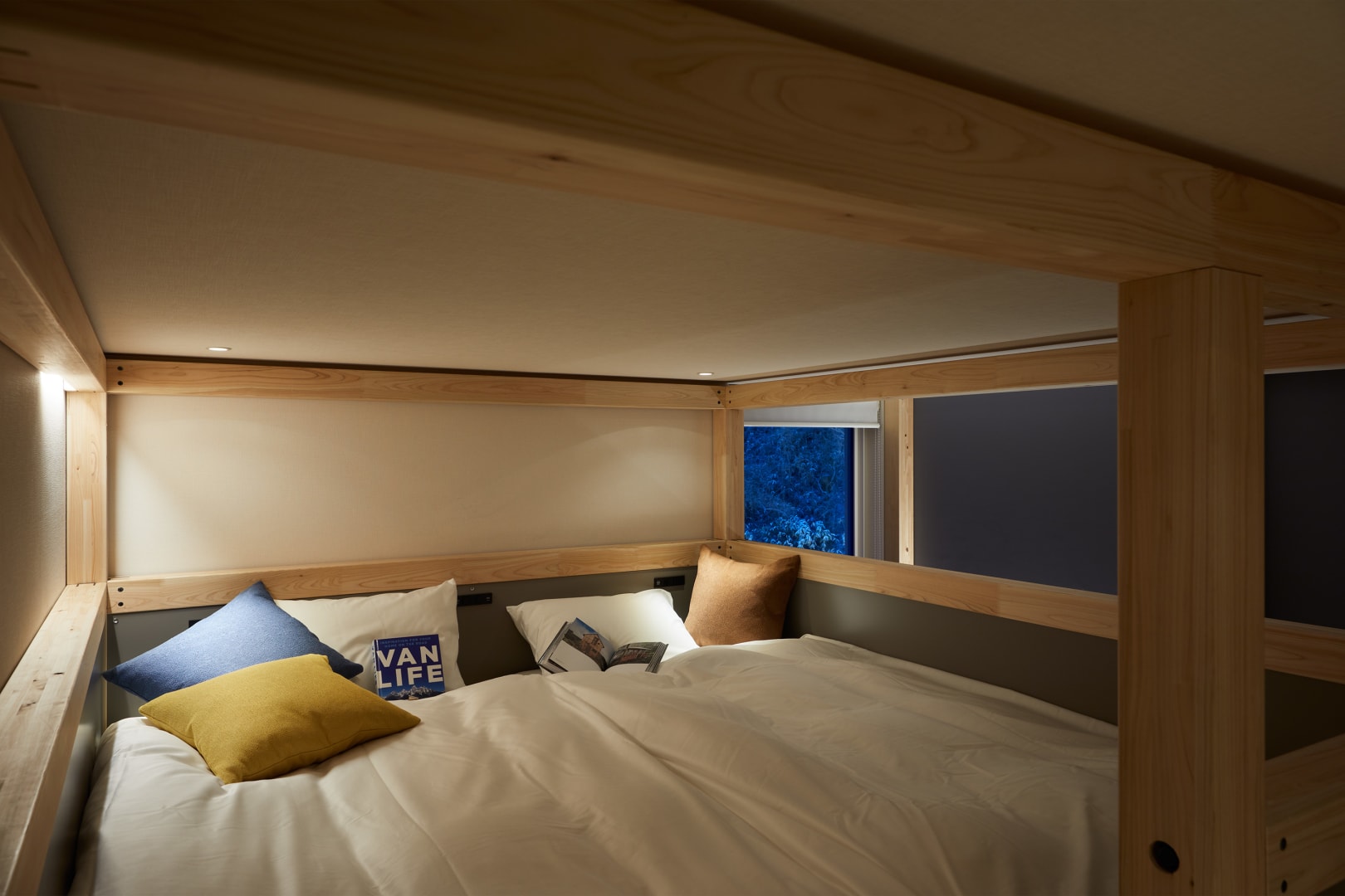You’ll feel like you’re back in college in this cozy lofted room with beds on top and floor-level sofa on the bottom.